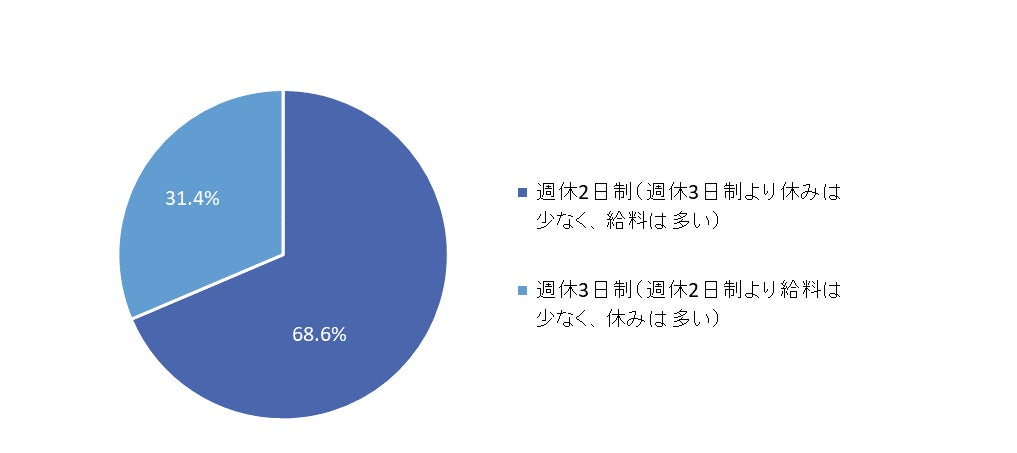 入社後、「週休2日制(週休3日制より休みは少なく、給料は多い)」と「週休3日制(週休2日制より給料は少なく、休みは多い)」を比較してどちらの勤務体系が良いかを聞いたところ、68.6%の学生が「週休2日制」と回答した。「ある程度の給与が見込めないと生活が厳しいため、現状では休みよりも給料を取らざるを得ない」のような経済的理由や、「仕事に時間をかけて、社会人として成長したい」という成長意欲が感じられる理由が見られた。一方、週休3日制を選択した学生からは、「副業・兼業や資格取得の時間に充てたい」という声や、人生100年時代を見据えて休息や健康を重視する声が上がった。【図5、6、7】