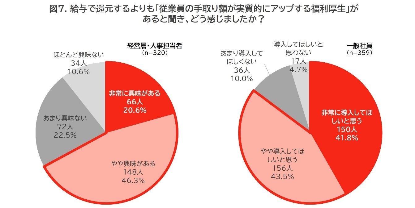 一方で、「第3の賃上げ」未導入の人に手取り額が実質的にアップする「第3の賃上げ」に興味があるか聞いたところ、経営層・人事担当者の7割近く(66.9%)が「非常に興味がある/やや興味がある」と回答し、一般社員の9割近く(85.3%)が「非常に導入してほしい/やや導入してほしい」と回答(図7)。「第3の賃上げ」の潜在的ニーズは非常に高いことが伺えます。