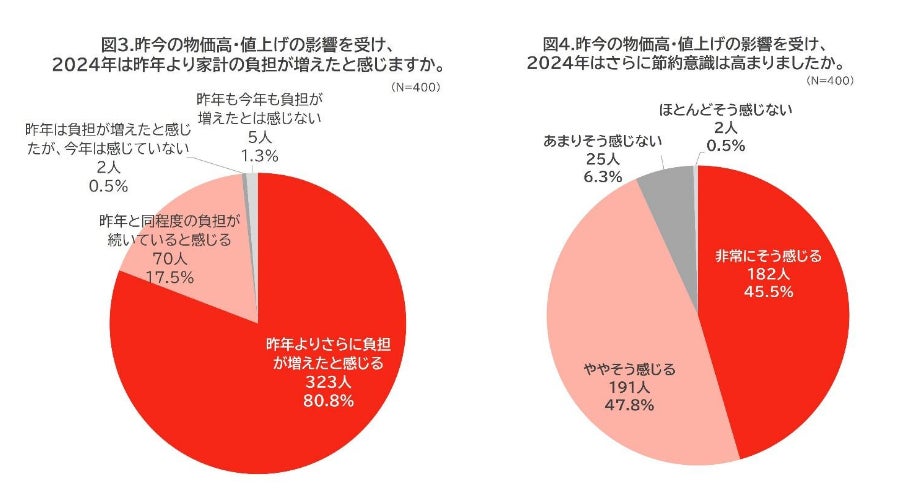 8割以上が、2024年は前年より家計の負担が増えたと回答。