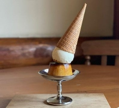 自家焙煎珈琲とスイーツのお店が誇る、地元産の卵にクリームチーズを加えたコクのあるプリン。この上に、アイスクリームダイナー「 BIG BABY ICE CREAM®」のミルクアイスクリームとコーンをのせた、インパクト大のひと品がお目見え。カラメルの苦味にもこだわったプリンと、クリーミーなアイスクリームが絶妙なハーモニーを奏でます。