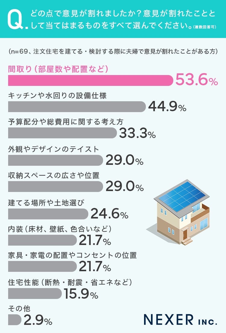 一番多かったのが「間取り(部屋数や配置など)」の53.6%、次いで「キッチンや水回りの設備仕様」が44.9%、「予算配分や総費用に関する考え方」が33.3%、「外観やデザインのテイスト」と「収納スペースの広さや位置」が29%でした。