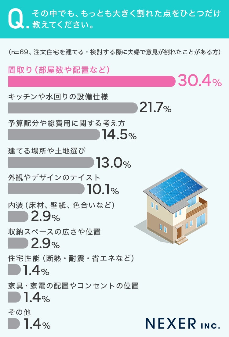 30.3%が、注文住宅を建てる・検討する際に夫婦で意見が割れたことが「ある」と回答し、もっとも多い揉めた理由は「間取り」が30.4%でした。