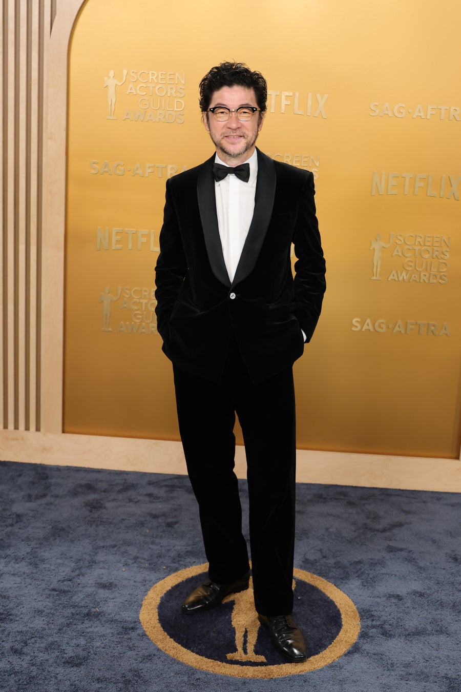 浅野忠信は、ブラックのベルベットのショールカラーシングルブレストタキシードに、ホワイトシャツ、ブラックのシルクの蝶ネクタイ、ブラックのダービーを合わせました。
