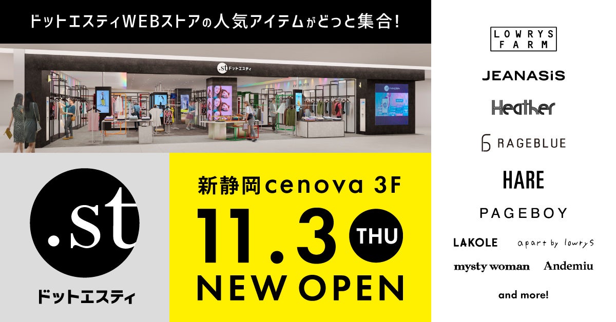 「Play fashion!」をミッションに掲げ、”グッドコミュニティ共創カンパニー”を目指す株式会社アダストリア(本部:東京都渋谷区渋谷2-21-1、代表取締役社長:木村 治)は、東海エリア初となるアダストリアグループ公式WEBストア 「.st(ドットエスティ)」のOMO型店舗 「ドットエスティ新静岡セノバ店」を、11月3日(木)にオープンいたします。また、11月3日(木)・4日(金)には、「STAFF BOARD」で活躍する人気スタッフによる来店イベントを実施いたします。