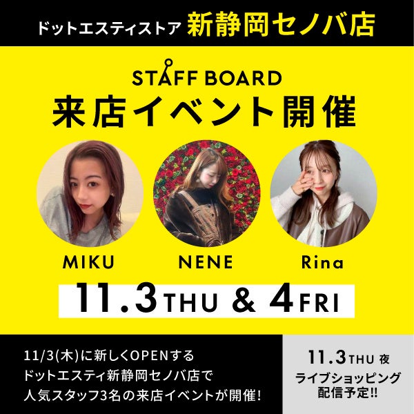 11月3日(木)・4日(金)の2日間、約4,000名のスタッフが日々のライフスタイルを発信するドットエスティ内のコンテンツ「STAFF BOARD」で人気のスタッフ3名が、日本各地から新静岡セノバ店に集結!お客さまのご来店をお迎えいたします。また、11月3日(木)20:30より、新静岡セノバ店からドットエスティLIVEを配信予定です。