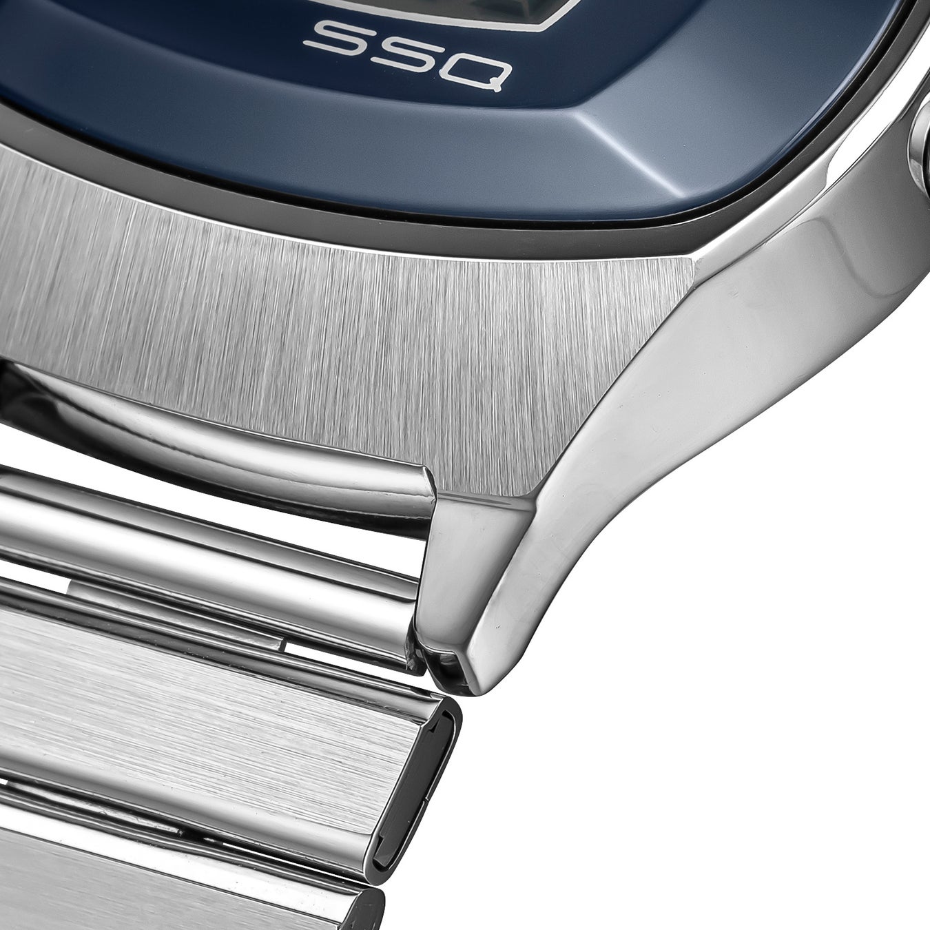 液晶周りにはコンケーブした樹脂製のパーツをはめ込み、そこにブランドロゴのほかに当時最先端技術だったSSQ(訳注:Solid State Quartzの略。ICチップやトランジスタなどの半導体技術と水晶振動子を組み合わせた精度の高い電子式時計のこと。)の文字が入っています。