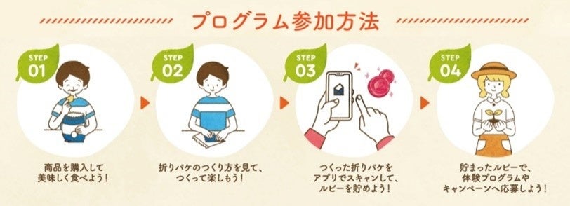 カルビーのスマートフォンアプリ「カルビー ルビープログラム」内で募集しています。折りパケの対象となるカルビー商品の空き袋を指定の形に折りたたんで「ルビープログラム」上で撮影すると、ルビー(ポイント)を獲得できます。500ルビー貯まるごとに1回応募ができます。キャンペーン期間中、お一人さま何度でも応募いただけます。