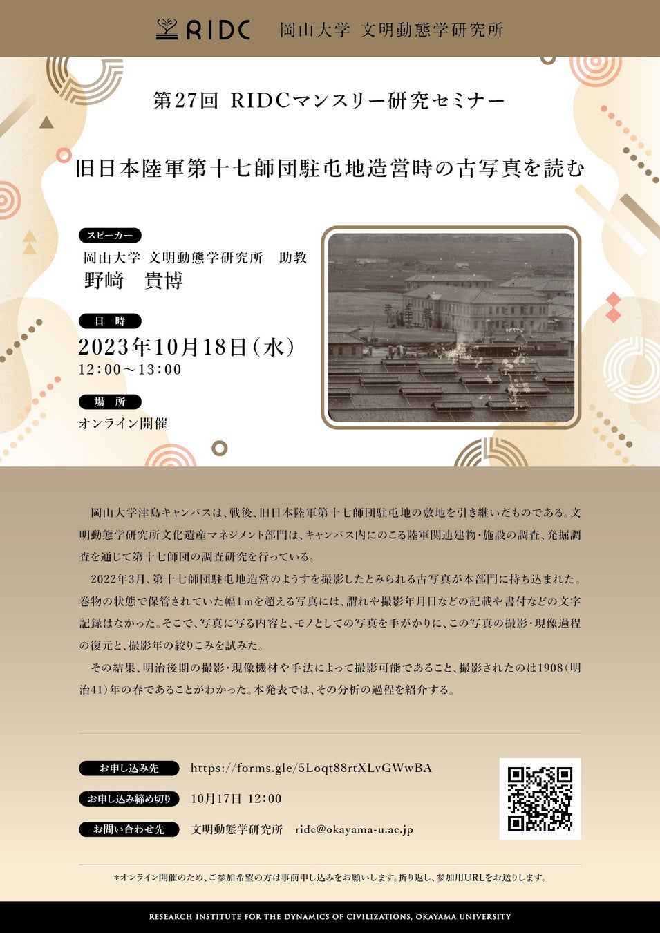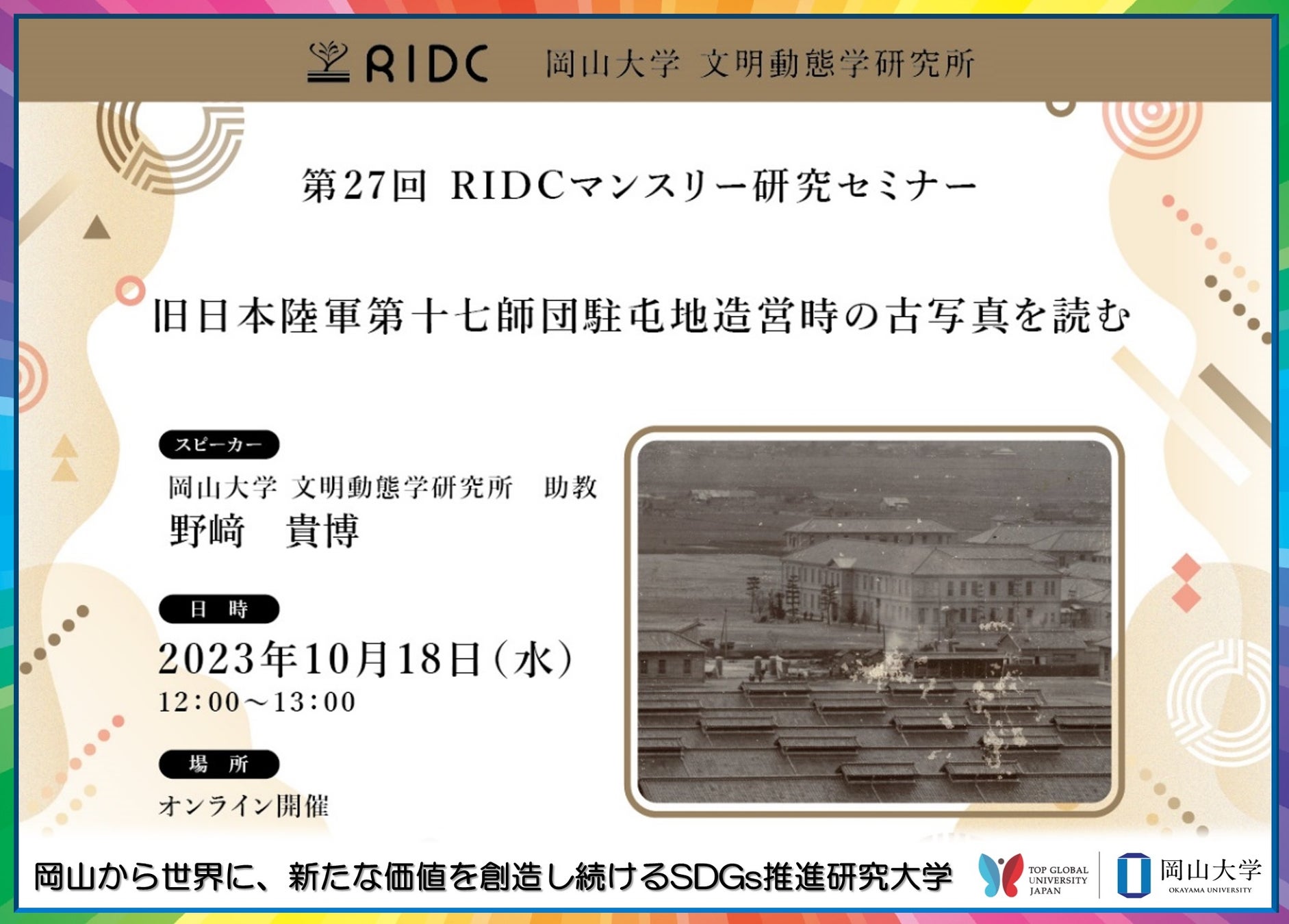 【岡山大学】文明動態学研究所「旧日本陸軍第十七師団駐屯地造営時の古写真を読む」〔10/18,水 オンライン〕