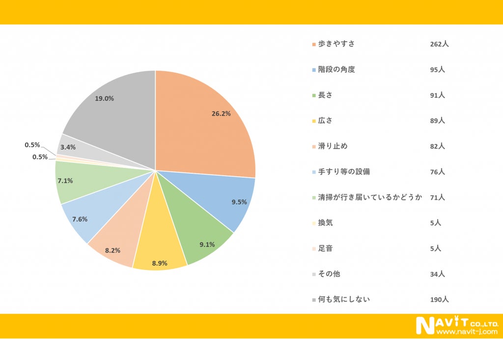 「駅の階段で一番気になることはなんですか?」という質問については、「歩きやすさ」が26.2%、「階段の角度」が9.5%、「長さ」が9.1%という順になりました。