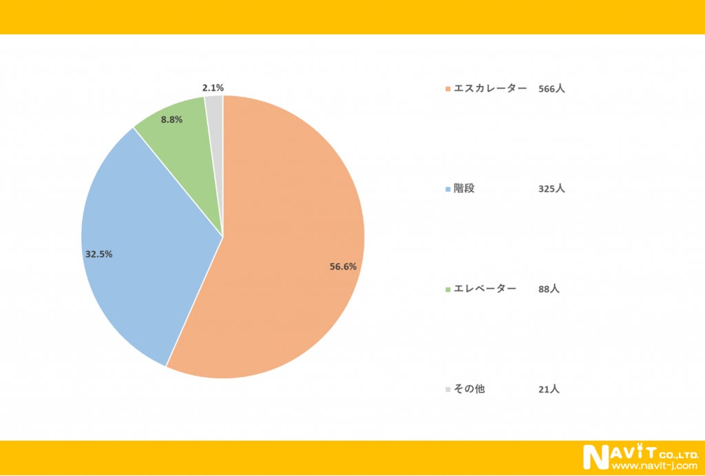 「駅の階層移動はどれを使う事が一番多いですか?」という質問については、「エスカレーター」が56.6%、「階段」が32.5%、「エレベーター」が8.8%という順になりました。
