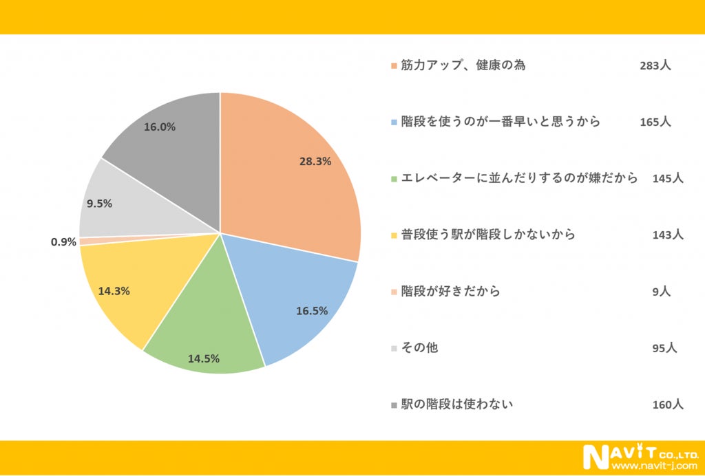 駅の階段を使う理由は、「筋力アップ、健康の為」が最多
