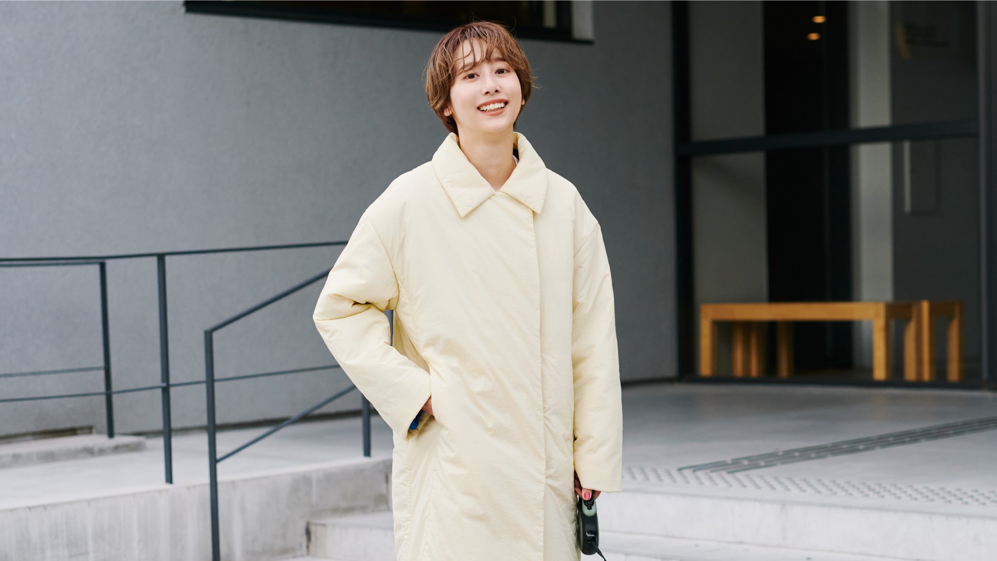 中綿入りのパファーコートは、真っ直ぐなシルエットがスタイリッシュな印象を演出。両裾にあしらったファスナー付きのスリットを開けると、足元に抜け感をプラスする。