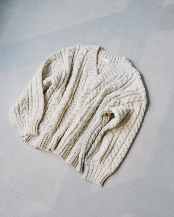 昨年好評だったVネックのケーブルニットを、ざっくりとした編み地でアップデート。ゆったりとしたサイジングは、シャツやタートルネックを重ねてレイヤードを楽しみたい。肉厚感のある立体的な風合いは、温もりたっぷり。