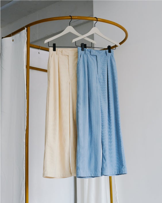 太ももから裾に向けて入った深いタックがポイントのワイドパンツ。ストレッチ性と穿き心地に優れたソフトなコーデュロイ生地は、太い畝で存在感を演出。今季のトレンドであるペールトーンの色展開で、冬の着こなしも軽やかに。