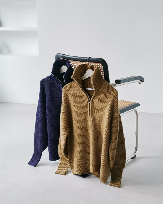 ミリタリーウェアに着想を得たハーフジップニット。ファスナーを開けて首元からインナーを見せても、襟を立てて立体感を出しても、美しく着こなせる。やや光沢感のある糸をしっかりと編み立てた、肉厚感のある触り心地。