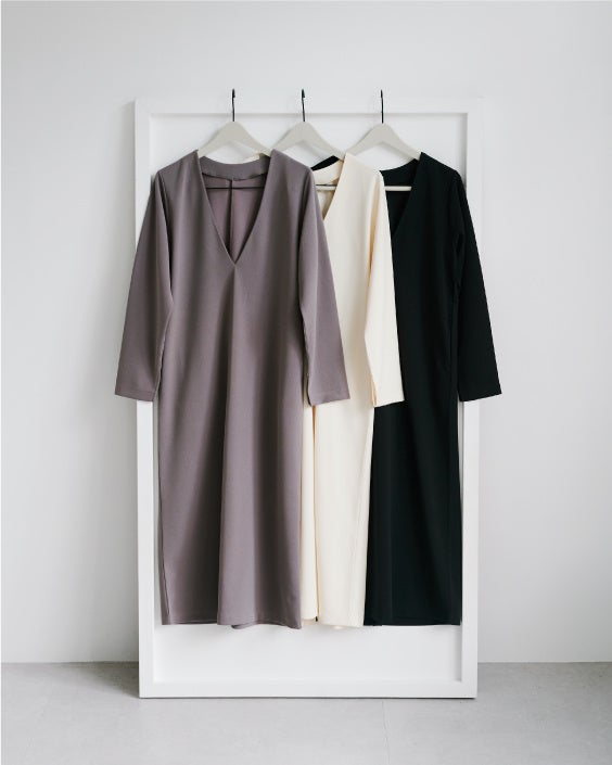 シーズンレスかつ様々なシーンで活躍するVネックロングワンピース。シボ感と膨らみがあるジョーゼット素材を用いることで、高級感と快適性を兼ね合わせている。着丈の長さのみ寸法を変えた、SSとSサイズ展開。