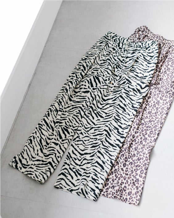 春夏で展開したリラックス感のあるイージーパンツを冬仕様にアレンジ。旬のゼブラ柄とレオパード柄を、落ち着いた配色で大人向けに仕上げている。ボリュームのあるニットに合わせて、メリハリのあるスタイリングに。