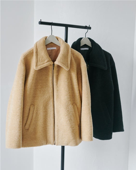 程よいボリューム感のボアジャケットは、ふっくらとした風合いと光沢感で上品に。襟を立ててストラップを留めるとすっきりとまとまり、また違ったスタイルを楽しめる。中にニットを着てもかさばらない、ゆとりのあるシルエット。
