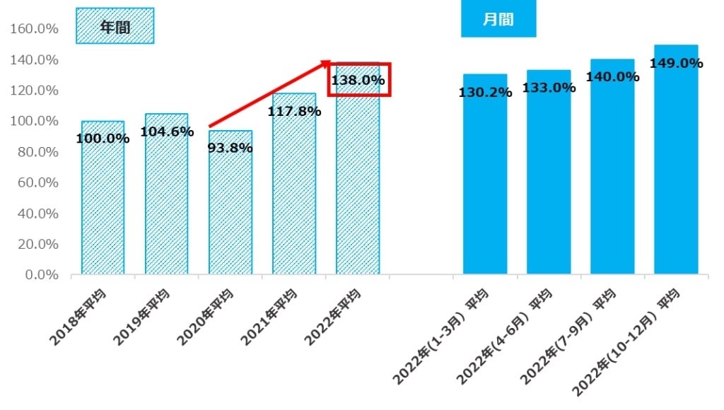 求人件数は2018年比平均138.0%で、2020年以降求人件数は増加傾向にある。2022年の推移を3カ月ごとにみると、2018年以降最高値を更新し続けている。企業の採用意欲は、新型コロナウイルス感染拡大前以上に高まっている。