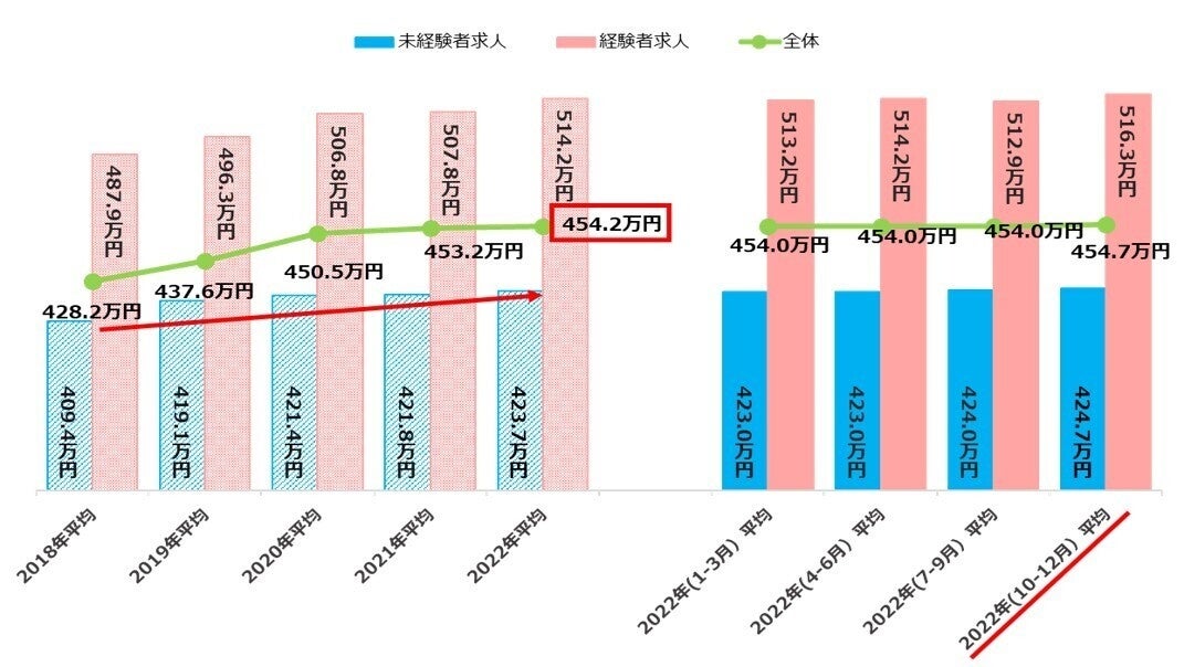 2022年の平均初年度年収は454.2万円、2018年平均から26.0万円の増加。求人件数は過去最高、新型コロナウイルス感染拡大前を超える回復ぶり。