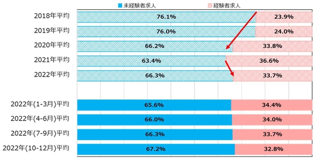 求人の経験者/未経験者の募集比率は、未経験者求人が66.3%、経験者求人が33.7%だった。経験者求人は2021年平均まで増加傾向にあったが、2022年平均では未経験者求人が増加に転じた。【図2、3】