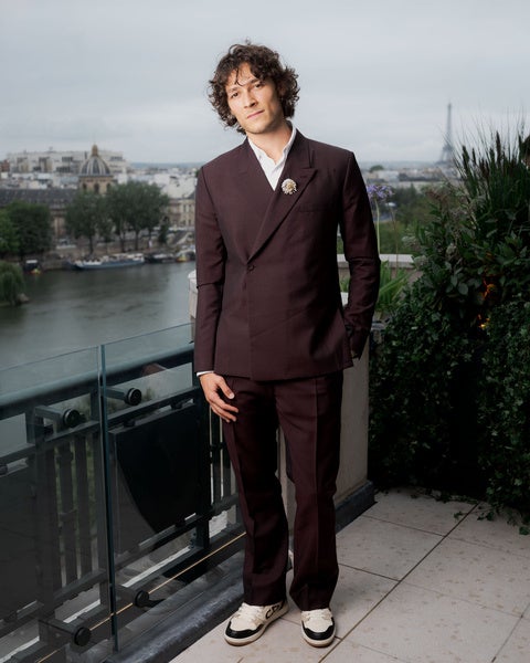 ユーゴ・マルシャンは、メンズ コレクションよりワインレッドのウールのピークドラペル「オブリーク」スーツに、クラシックなホワイトコットンシャツを纏い、ホワイトレザーの「B57」スニーカーを合わせました。