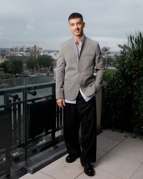 ニコラス・モーリーは、2025年サマー メンズ コレクションよりライトブルーのウールジップジャケットに、クラシックなホワイトシャツ、ベージュのウールパンツを纏い、ベージュレザーのケープタウンブーツを合わせました。