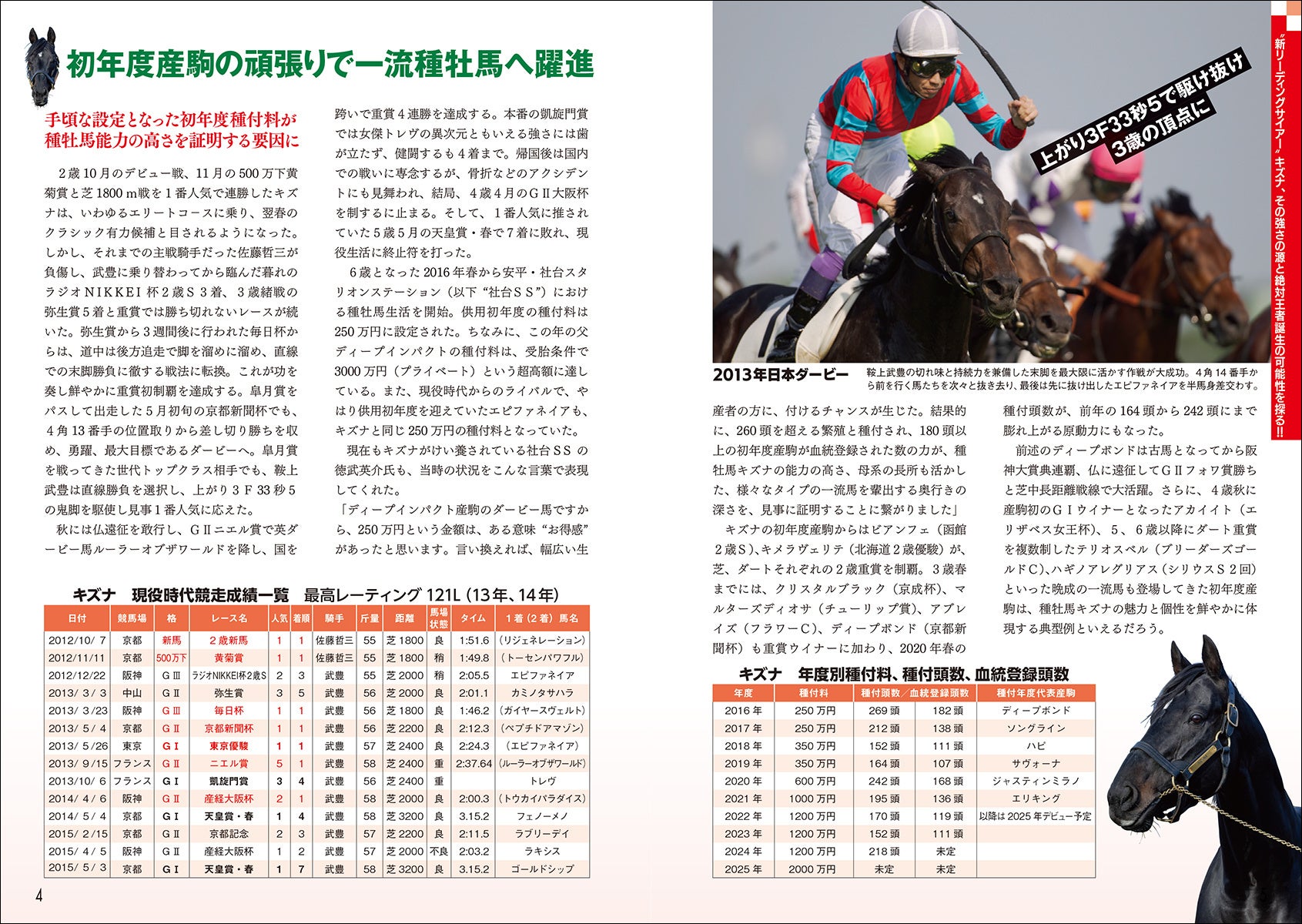 大種牡馬ディープインパクトが亡くなって5年の節目に、その産駒である種牡馬キズナがリーディングサイアーに輝こうとしています。そのキズナに焦点をあてた特集になります。2025年に産駒がデビューするコントレイルとのディープインパクトの後継者争いや他のディープインパクト産駒の種牡馬たちの動向なども探ります。