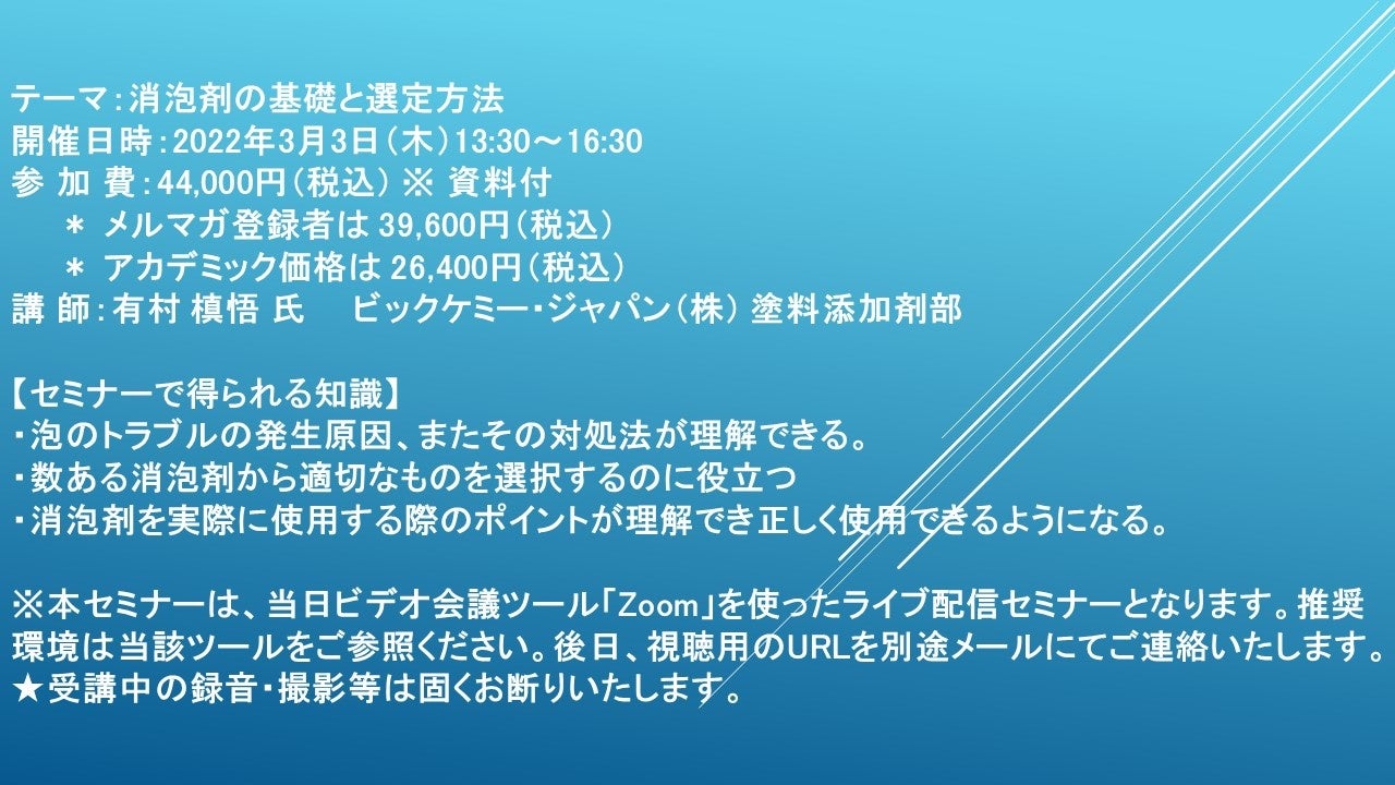 先端技術情報や市場情報を提供している(株)シーエムシー・リサーチ(千代田区神田錦町: https://cmcre.com/ )では、 各種材料・化学品などの市場動向・技術動向のセミナーや書籍発行を行っておりますが、 このたび「消泡剤の基礎と選定方法」と題するセミナーを、 講師に有村 槙悟 氏 ビックケミー・ジャパン(株) 塗料添加剤部)をお迎えし、2022年3月3日(木)13:30より、 ZOOMを利用したライブ配信で開催いたします。 受講料は、 一般:44,000円(税込)、 弊社メルマガ会員:39,600円(税込)、 アカデミック価格は26,400円(税込)となっております(資料付)。