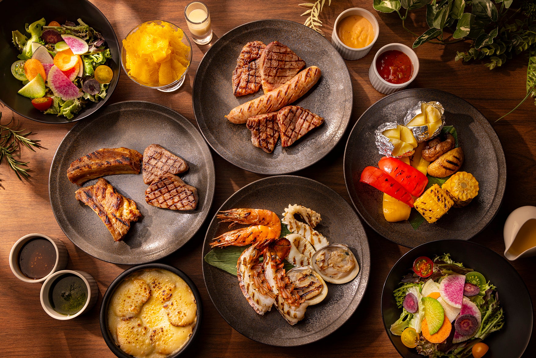 中でも、肉好きの方におすすめの「ミートラバーセット」では、国産牛サーロインや葡萄牛リブアイ、ビッグソーセージに加え、焼き野菜やシェフ特製カレーも好きなだけお楽しみいただけます。また、カップルやグループ利用におすすめの「ブラックアンガストマホークプレート」では、約1kgのトマホークステーキが登場!お好みの焼き加減で、迫力満点のボリュームとジューシーな旨みをご堪能いただけます。