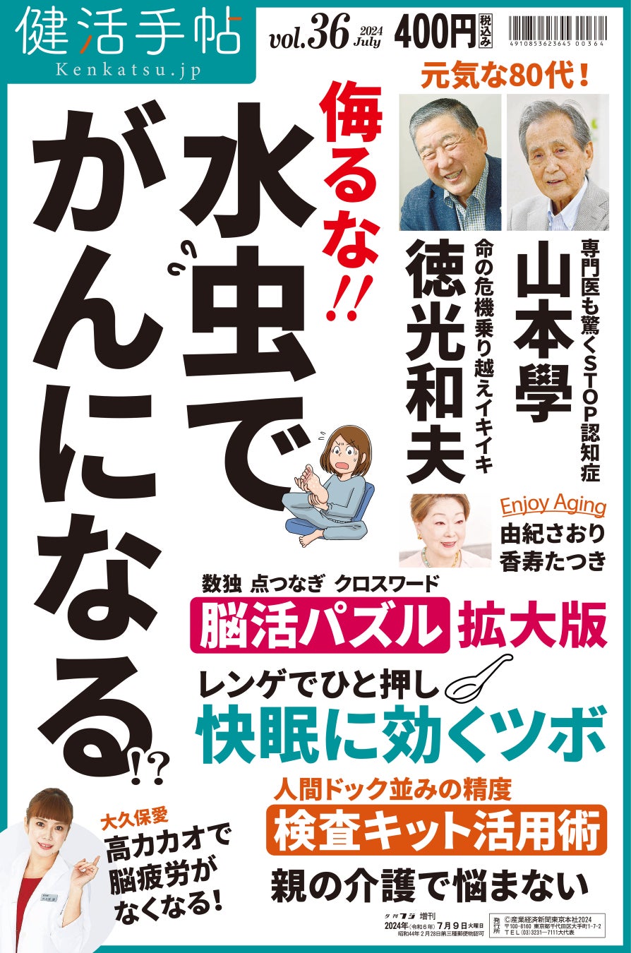 侮るなかれ、水虫が発がんに関与ーその危険な相関を追跡しました。このほか元気な80代を特集。軽度認知障害(MCI)と闘う名優・山本學さん(87)と認知症予防の第一人者、朝田隆医師のロング対談は必読です。「命の危機」を乗り越えた徳光和夫さん(83)は自然体健康法を語ります。