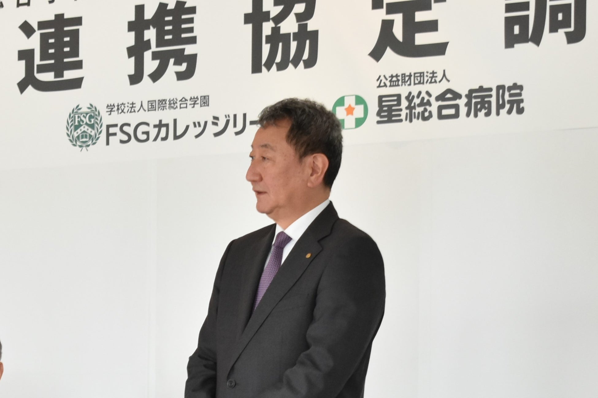 調印は公益財団法人 星総合病院は星北斗理事長、FSGカレッジリーグは5校を代表し、国際医療看護福祉大学校 佐藤本実学校長が署名を行いました。