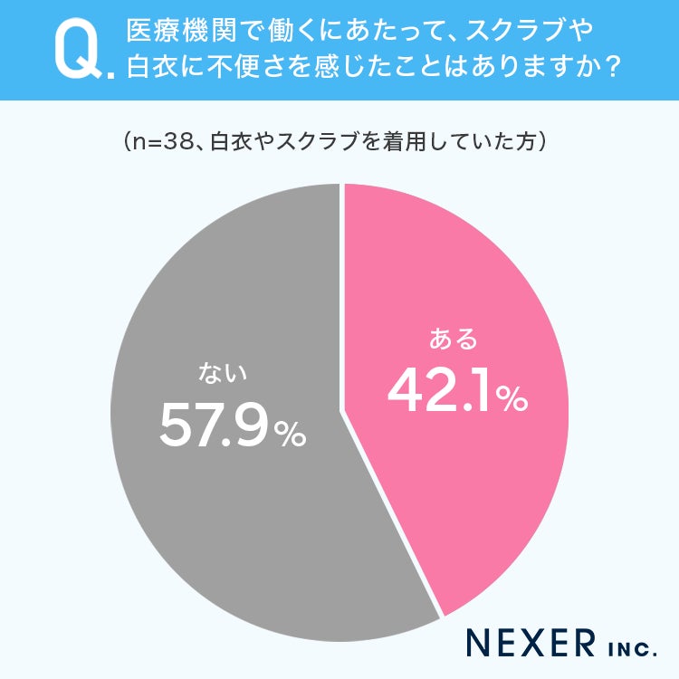 42.1%の方が医療機関で働くにあたって、スクラブや白衣に不便さを感じたことが「ある」と回答しています。