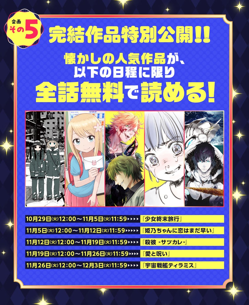 懐かしの人気作品・全5タイトル(※『少女終末旅行』『愛と呪い』など)が、各7日間限定で無料公開!
