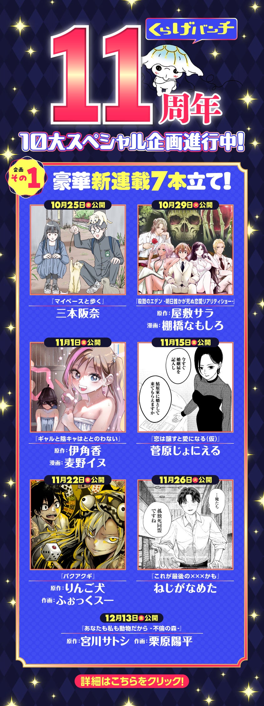 そんな「くらげバンチ」が11周年を迎えたことを記念し、長年応援してくださった皆さまに感謝を込めて、10大企画を実施いたします。