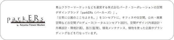 当社は、「その空間で毎日どのような時間をすごせるか」を大切にした空間づくりを行っており、「parkERs」のデザイン性の高い空間設計と植物を用いて日常に豊かさと公園のような心地よさを提供するコンセプトと親和性が高く、これまでも継続して生活に緑や花を取り入れるきっかけづくりを行ってまいりました。withコロナ時代において、以前よりも自宅で過ごす「おうち時間」が増える中で、住まう人が愛着をもち、リラックスして過ごせるような空間やサービスを提供し、緑や花と暮らす住まいをご提案してまいります。