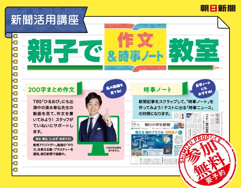 株式会社朝日新聞社(代表取締役社長:角田克)は、小中学生の親子向け無料イベント「親子で作文&時事ノート(スクラップ)教室」を全国で開催しています。 朝日新聞や朝日小学生新聞で連載中の教育アドバイザー清水章弘先生の動画を見ながら、200字作文の書き方や新聞記事を使った「時事ノート」の作り方を学びます。スタッフがわかりやすくアドバイスしますので、作文が苦手なお子さんや低学年のお子さんも安心してご参加いただけます。累計で1万5千人超が参加している大人気教室で、「作文がスラスラ書けるようになった!」「時事問題の勉強法がわかった!」など、参加者にも大好評!