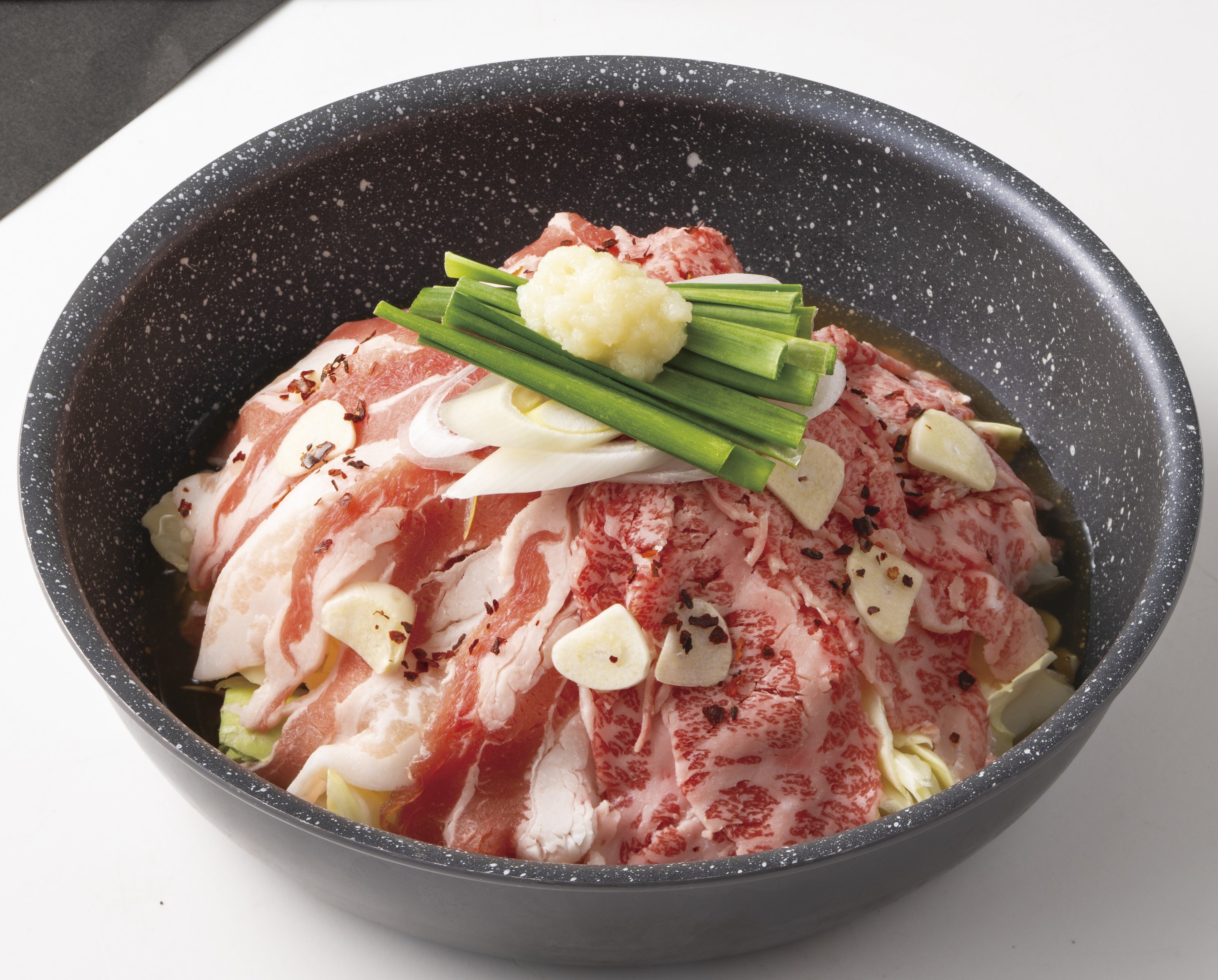 日本三大和牛の一つ、兵庫県産の神戸牛は、きめ細やかな肉質と上品な旨味が特長のブランド牛です。あわせて使用する霧島黒豚は、やわらかな肉質と脂の甘味が評価されているブランド豚。本企画では両素材を組み合わせ、貝出汁の旨味とともに楽しめる陶板焼として仕上げました。肉の旨味はもちろんのこと、その旨味をたっぷり吸った野菜もおすすめです。〆にはしじみちゃんぽん麺で貝出汁とブランド牛、ブランド豚の旨味を最後までお楽しみください。