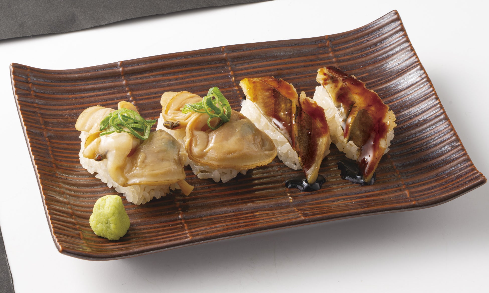 春に旬を迎えるハマグリは加熱することで旨味が増し、穴子は脂のりがよく、身質はやわらかく仕上げており春らしい握りにます。