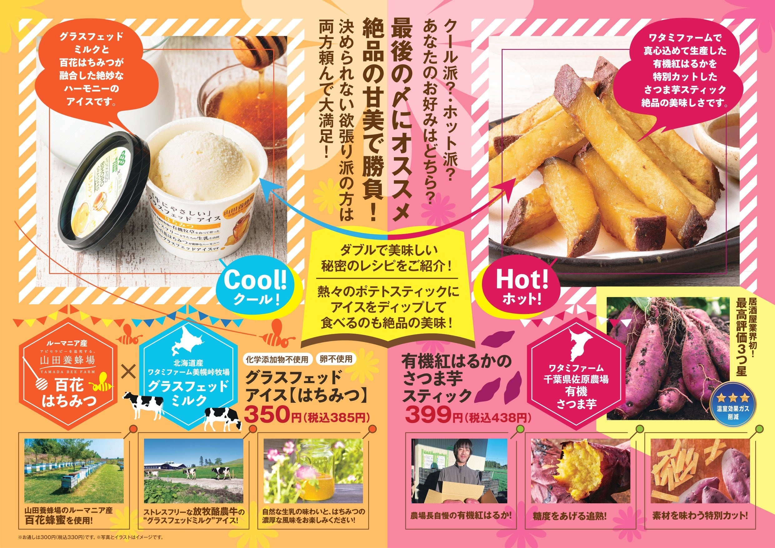 グランドメニューでも人気のデザート、ワタミファームの北海道美幌峠牧場で採れた生乳と、山田養蜂場のはちみつを掛け合わせた素材本来の甘さをたのしむグラスフェッドアイス【はちみつ】もおすすめです。ぜひ、さつま芋スティックをグラスフェッドアイスにディップしてお召し上がりください。
