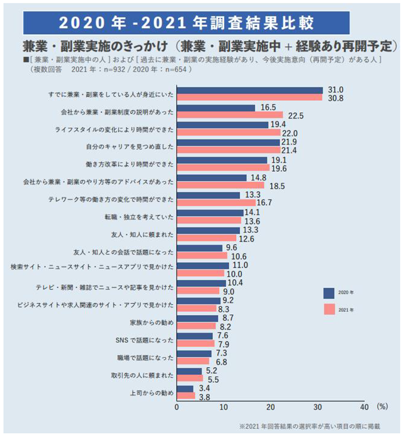 下のグラフは、「兼業・副業実施中の人」および「過去に兼業・副業の実施経験があり、今後実施意向(再開予定)がある人」を対象に聞いた「兼業・副業実施のきっかけ」です。2020年と2021年の調査結果を比較しています。