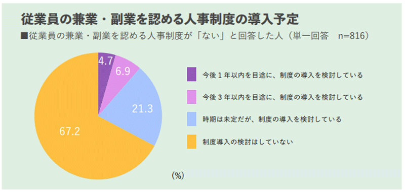 実際、企業側でも兼業・副業の制度が充実しつつある状況がデータに表れています。本調査は企業の人事担当者も対象に行っており、兼業・副業を認める人事制度の有無を聞いたところ、「制度がある」と回答したのは50.5%と、過半数に達しました。「制度がない」と回答した人事担当者も、うち3割強が「導入を検討している」と、積極的な姿勢を見せています。