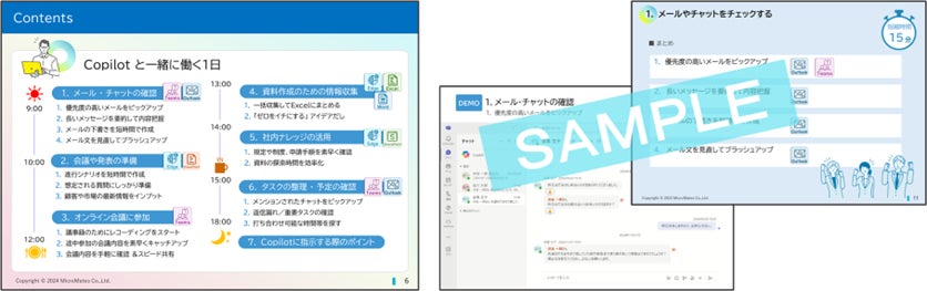 マイクロメイツでは、生成AIを有効活用できる人材の育成プログラムとして、「Microsoft 365 Copilot」の活用方法を簡潔にまとめたクイックリファレンス※2を使用して利活用促進や定着化を目指す研修トレーニングの提供をしています。今後、営業や人事、労務など特定の業務に焦点を当てたコンテンツや研修の開発も予定しています。