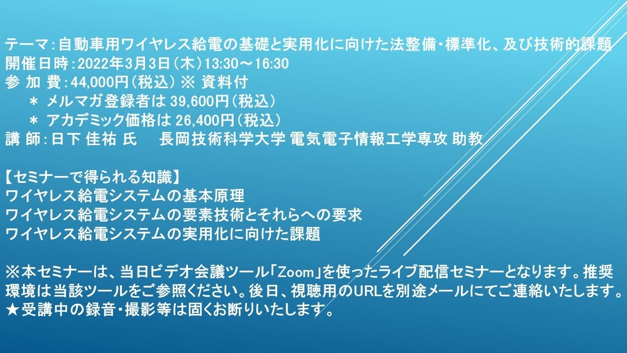 先端技術情報や市場情報を提供している(株)シーエムシー・リサーチ(千代田区神田錦町: https://cmcre.com/ )では、 各種材料・化学品などの市場動向・技術動向のセミナーや書籍発行を行っておりますが、 このたび「自動車用ワイヤレス給電の基礎と実用化に向けた法整備・標準化、及び技術的課題」と題するセミナーを、 講師に日下 佳祐 氏 長岡技術科学大学 電気電子情報工学専攻 助教)をお迎えし、2022年3月3日(木)13:30より、 ZOOMを利用したライブ配信で開催いたします。 受講料は、 一般:44,000円(税込)、 弊社メルマガ会員:39,600円(税込)、 アカデミック価格は26,400円(税込)となっております(資料付)。