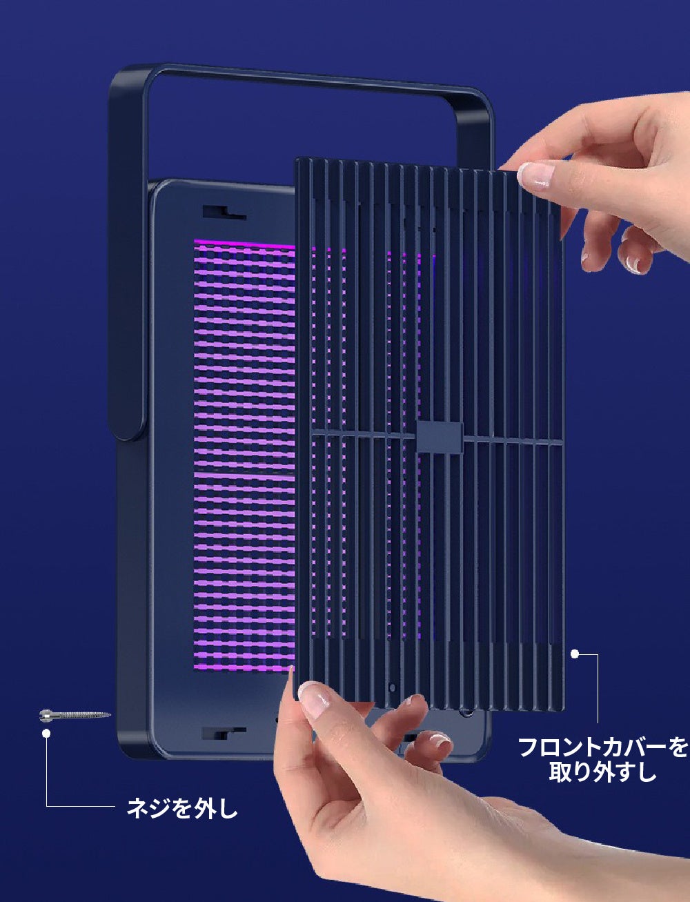アルミニウム材質を使用することで、エネルギー変換過程でのエネルギー損失を最小限に抑えづつ、蚊やハエが網に触れると2500Vの電気が流れる仕組みになっています。