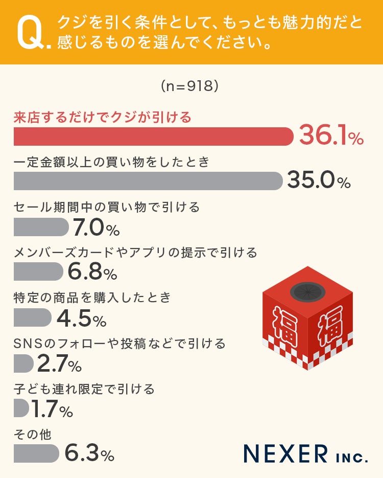 36.1%の方が「来店するだけでクジが引ける」、35%の方が「一定金額以上の買い物をしたとき」と回答しています。