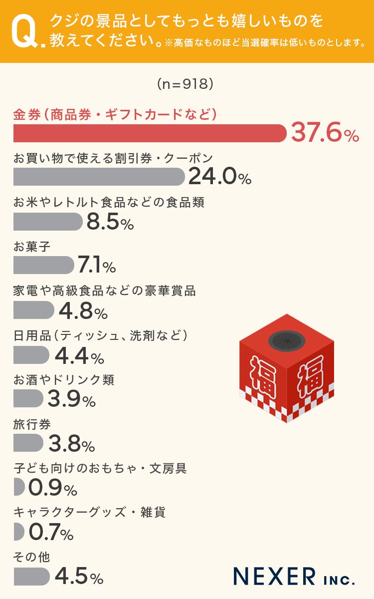 ■クジの景品としてもっとも嬉しいもの、約4割が「金券」で最多