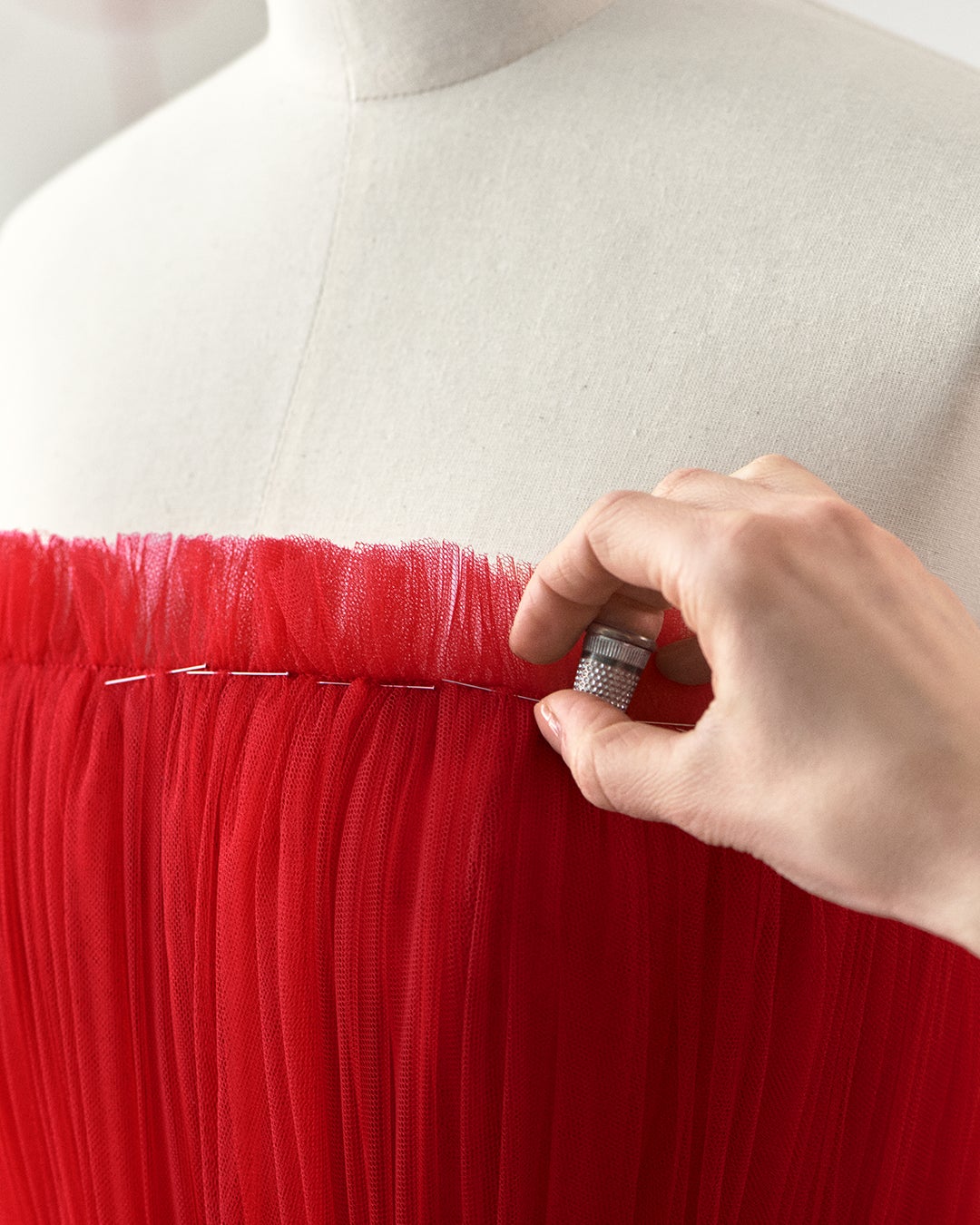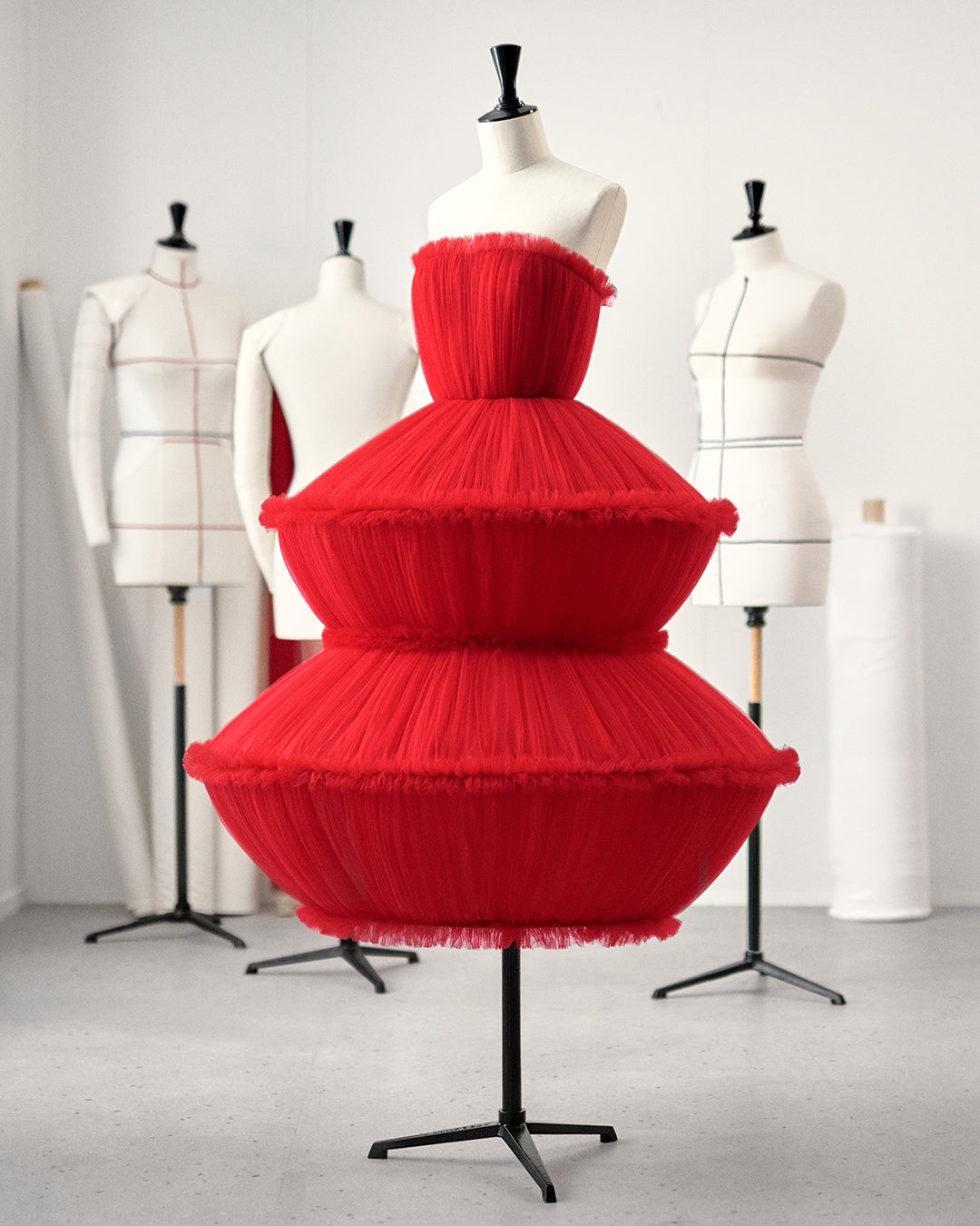 ダニエル·デッドワイラーが着用したチュールビスチェドレスは、すべて手作業によるプリーツ加工で円錐形断面の重ね合わせで作られています。それぞれの縫い目には、縁取りのレリーフが接合部を強調し、目に見えない超軽量の内部構造により、外側にプリーツチュールを重ねた建築的なフォルムがデザインされています。