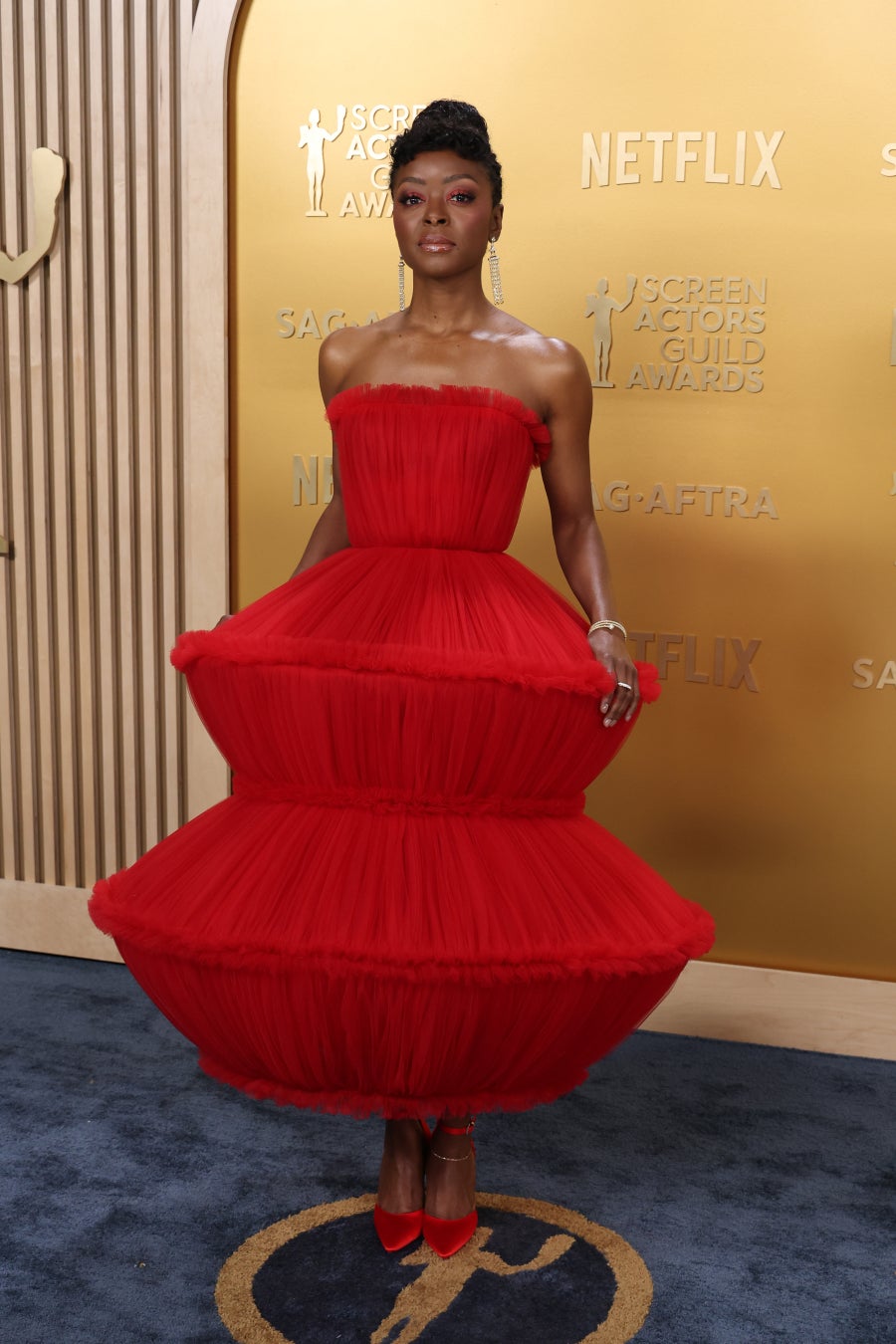 ダニエル·デッドワイラーは、カスタムメイドのレッドのストラクチュラルハンドギャザーチュールドレスとレッドのサテンパンプスを合わせました。