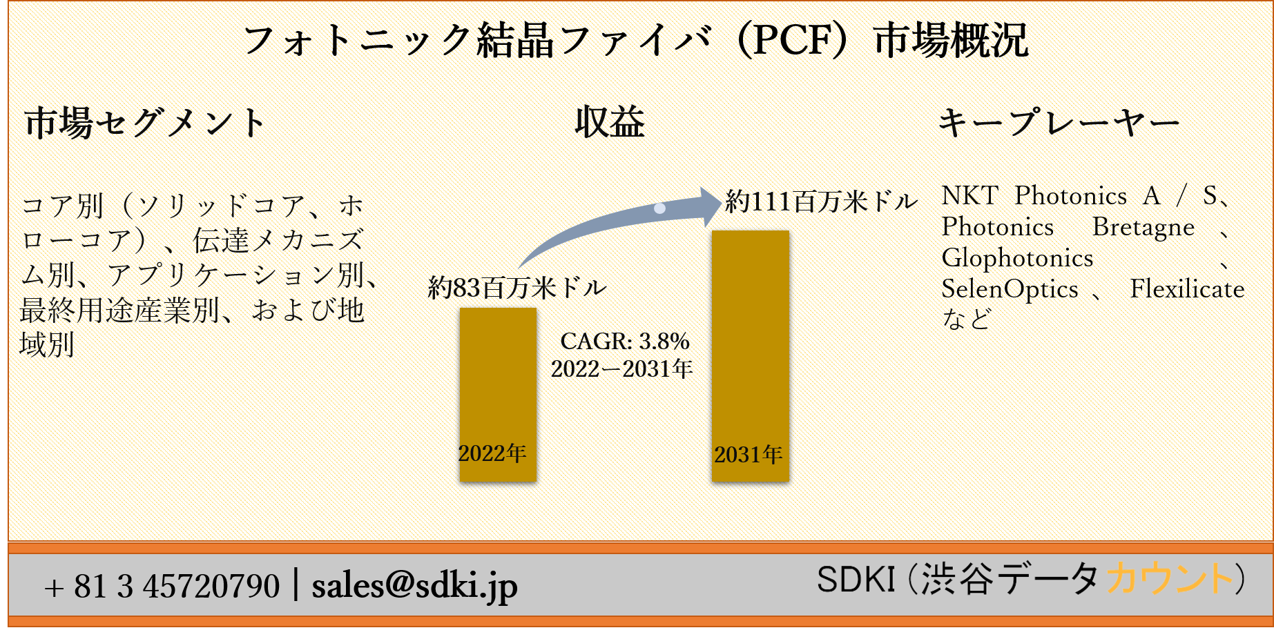 フォトニック結晶ファイバ(PCF)市場は、2022年に約83百万米ドルの市場価値から、2031年までに約111百万米ドルに達すると推定され、2022-2031年の予測期間中に3.8%のCAGRで成長すると予想されています。